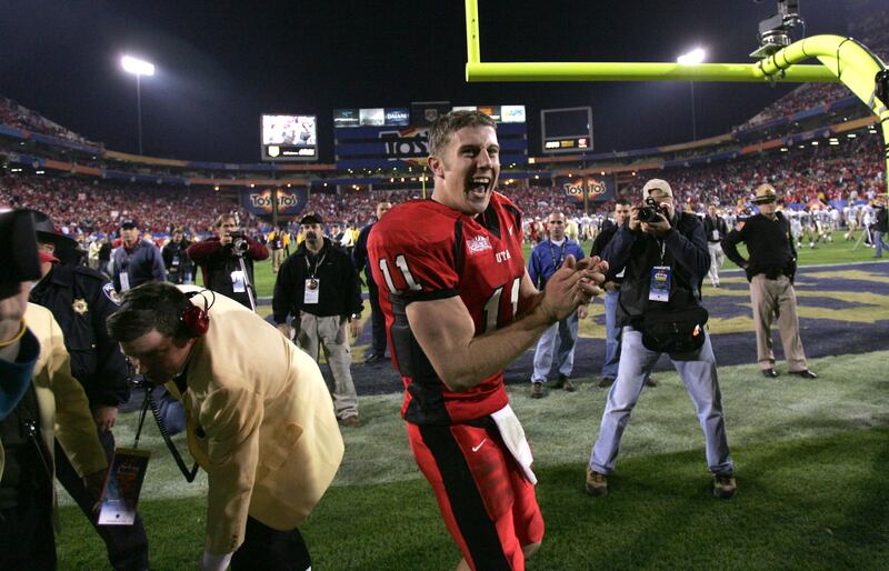 In the second game of the 2003 season, Brett Elliott, the team’s starting quarterback, broke his wrist, and Smith came on in relief and didn’t stop playing until he’d reeled off 21 wins in 22 games, finished fourth in the 2004 Heisman Trophy race, led the Utes to an unbeaten 2004 season and a No. 4 finish in the national rankings, and became the No. 1 overall pick in the NFL draft.