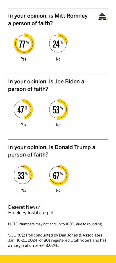 Among all Utah Latter-day Saints regardless of political party, those figures are comparable: 41% say Biden is a person of faith, and 85% say Romney is.