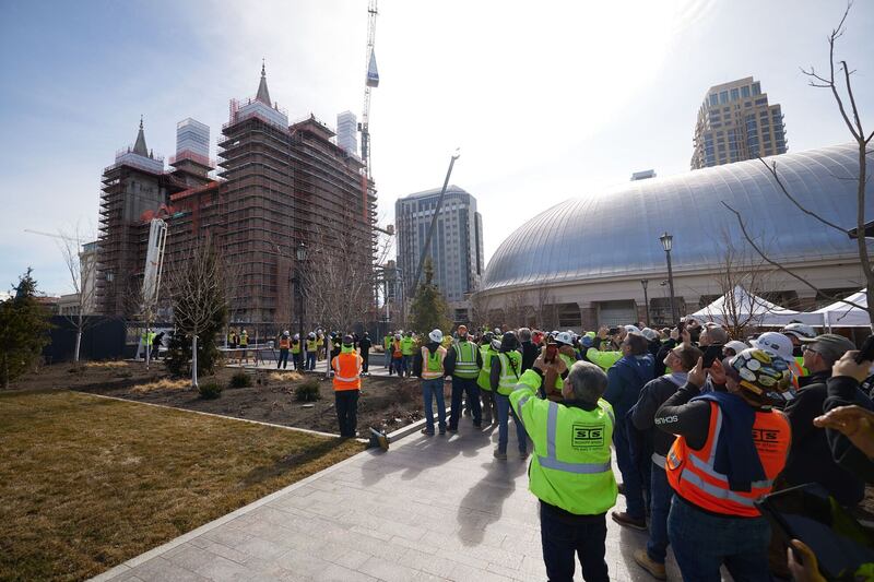 Some 800 construction team members attend the ‘topping-out’ ceremony — the placement of the final reinforcing steel pyramid atop the iconic house of the Lord