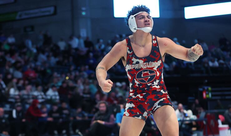 Other individual state champs include Maple Mountain’s Caleb Jackson (113), Wasatch’s Benjamin Kohler (126), Wasatch’s Max Richins (132), Wasatch’s Daxton Bonner (138), Box Elder’s Jackson Ricks (144), Spanish Fork’s Junior Wetzel (150), Spanish Fork’s Alex Koyle (165), Box Elder’s Brandon Murray (175), Springville’s Tevita Valeti (190), and Cyprus’ Skyler Armenta (285).