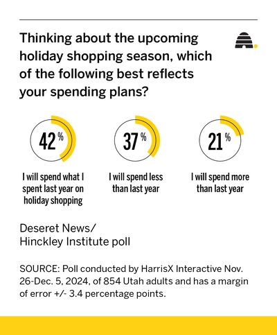 A plurality of Utahns, 42%, told pollsters they’ll be spending about what they did last year for the winter holidays while 37% said they’ll be spending less and 21% reported they’re upping the ante for 2024.