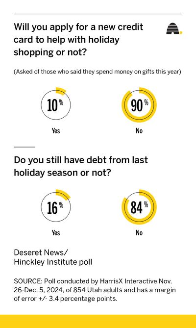 About a third of Utahns, 32%, who participated in the survey said they won’t be using credit to cover holiday expenditures this year but among those who will charge holiday purchases, 35% report they will pay their balances right away. The other third of poll participants said they’ll be pushing out their holiday credit card debt repayment for a while, with 9% reporting they’ll pay their balances by New Year’s, 16% by spring of next year and 8% sometime later in 2025.