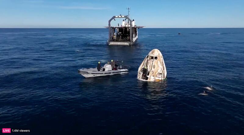 Recovery boats quickly responded after the capsule, slowed by four giant parachutes, entered the calm waters traveling around 16 m.p.h., completing a flight that left about 17 hours earlier from the ISS.