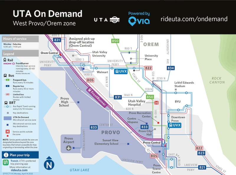 UTA's new West Provo/Orem service area, debuting on Monday, covers 8.6 square miles, connecting Provo's and Orem's FrontRunner stations with key destinations like the Provo Airport. Service will be available within the zone from 6 a.m. to 9 p.m. every day from Monday through Saturday.