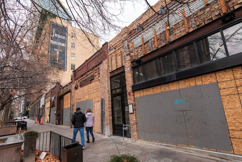 The sound of hammering from a pair of buildings in downtown Salt Lake City’s “restaurant row” is muffled by the plywood boards that cover their exterior windows on Main Street.