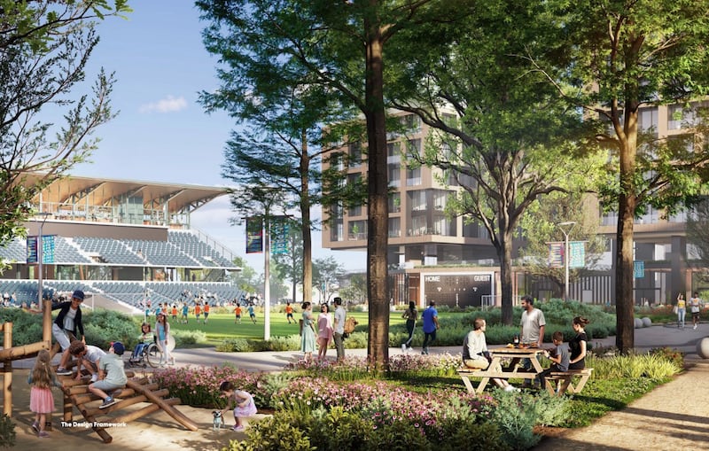 City planners say daylighting a section of the creek should help reduce some of the heating effects, as would more trees included in a promenade section and near the old playing surface. Some of the proposed building heights have also been trimmed after community feedback.