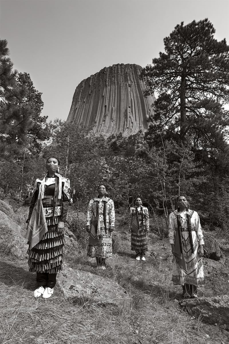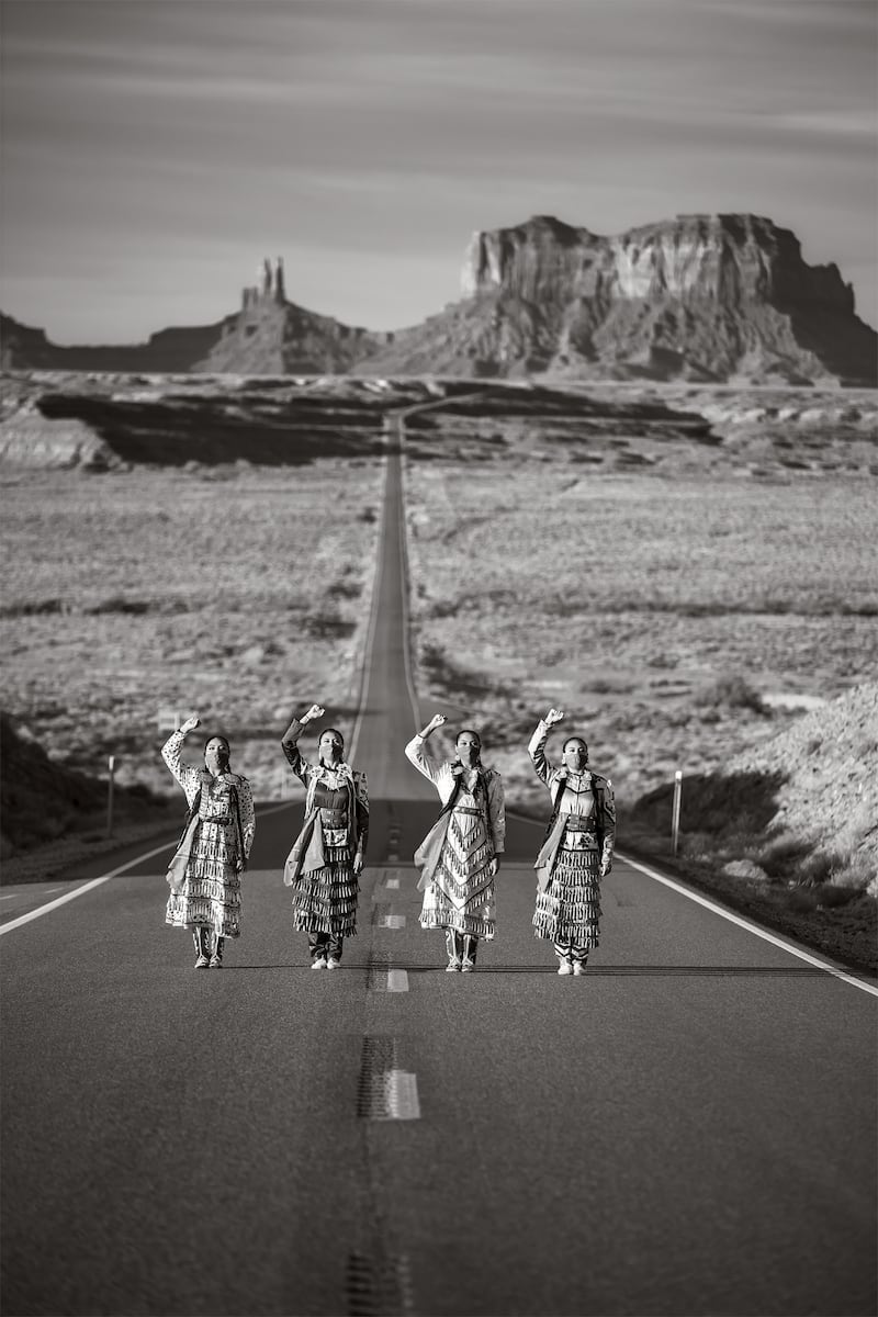 Eugene and the dancers’ first stop to shoot photos was the Bonneville Salt Flats. During the shoot, the group started talking about where to go next and discussed the idea of taking photographs of the jingle dress dancers at state and national parks as sort of a land reclamation for Native people. Soon, Eugene, his wife, Sharon, and the dancers — Dion Tapahe, Erin Tapahe, Sunni Begay and JoAnni Begay — were heading north to Grand Teton National Park and Yellowstone to create an image of what he saw in his dream. His goal was to use the curative powers of the jingle dress to aid with the COVID-19 pandemic. In Eugene’s words, the project is about capturing “a series of images to document the spiritual places our ancestors once walked, and to unite and give hope to the world through art, dance and culture to help us heal.”
