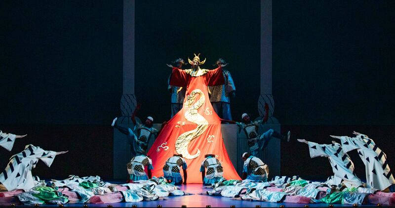 Matisse’s aesthetic is among the ballet’s most striking elements. While the sets were simple and stark, the costumes were anything but. A living tableau, the vibrant colors and patterns played off each other in exciting ways. The warriors’ faces and limbs were painted terracotta red against sky blue body armor. The court’s flowing tunics varied from color-blocked pinks, reds and greens to yellow florals and black-and-white triangle prints. The mechanical bird sported a rooster head and colorful plumage, and death was a spindly creature, also of head-to-toe terracotta red. The dancers’ mask-like, Peking Opera-style makeup added another layer of fantasy and mystique. The program notes offered interesting background about Matisse’s study of Chinese icons, statues and cave sculptures, as well as the Tibetan tantric traditions that also inspired him.