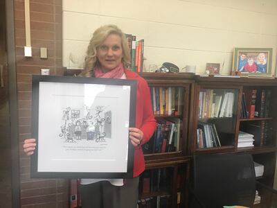 At the far end of her desk there’s a framed cartoon from The New Yorker magazine.