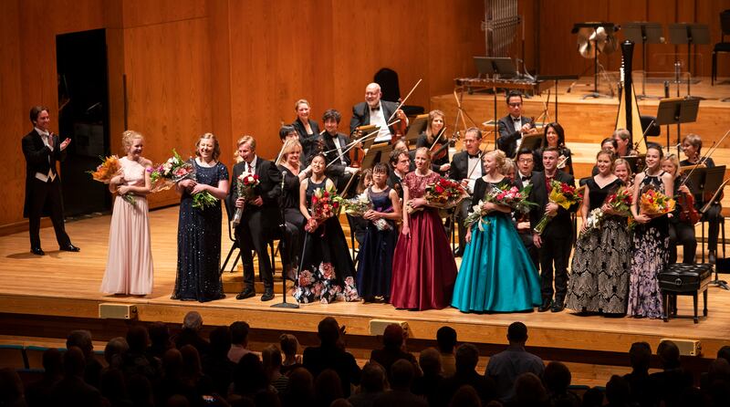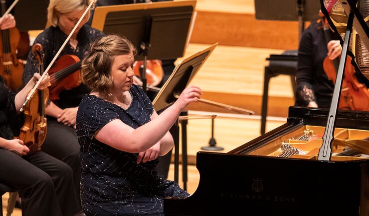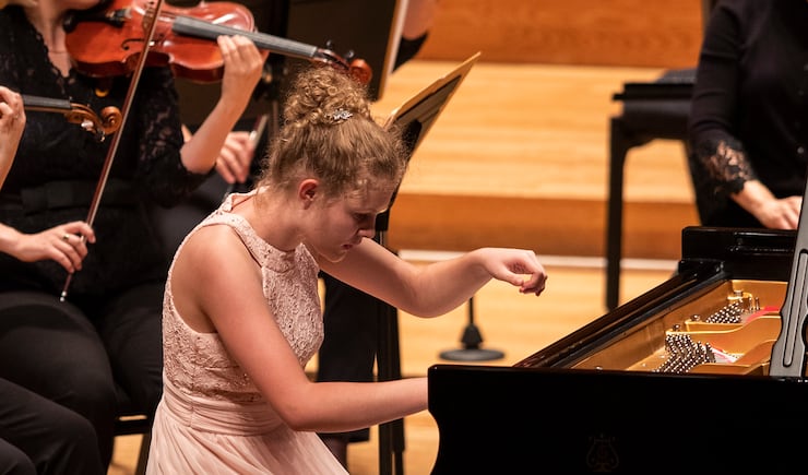 The second half was all about piano. Following Coombs’ performance, 18-year-old Avery Gunnell, a piano performance major at Brigham Young University, and 14-year-old Dora Meiwes showed off their prowess on the keys. Gunnell weaved and bobbed and seemed to feel every note of Edward MacDowell’s Concerto No. 2 in D minor, while Meiwes played with such fervor that she lifted off the bench multiple times during Sergei Rachmaninoff’s Concerto No. 2 in C minor. It was a fitting conclusion to the night, one that likewise got the audience out of their seats.