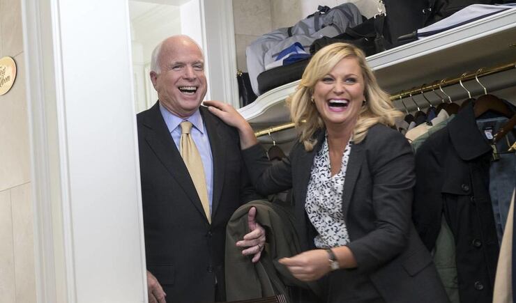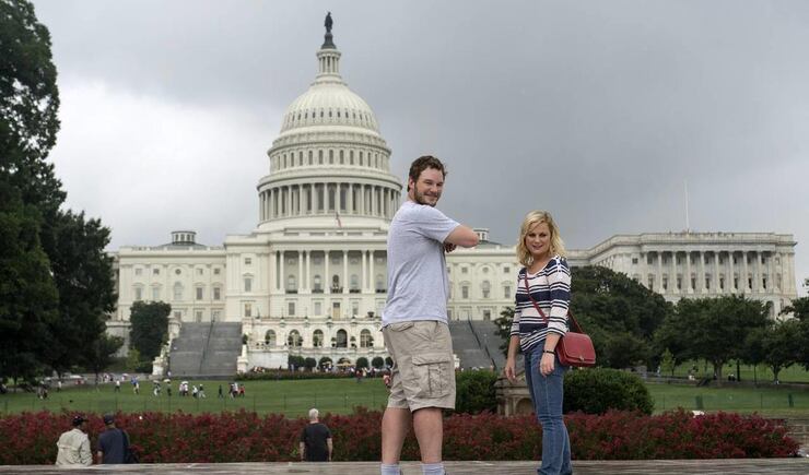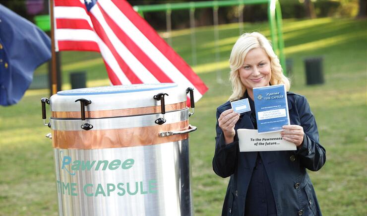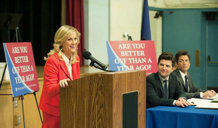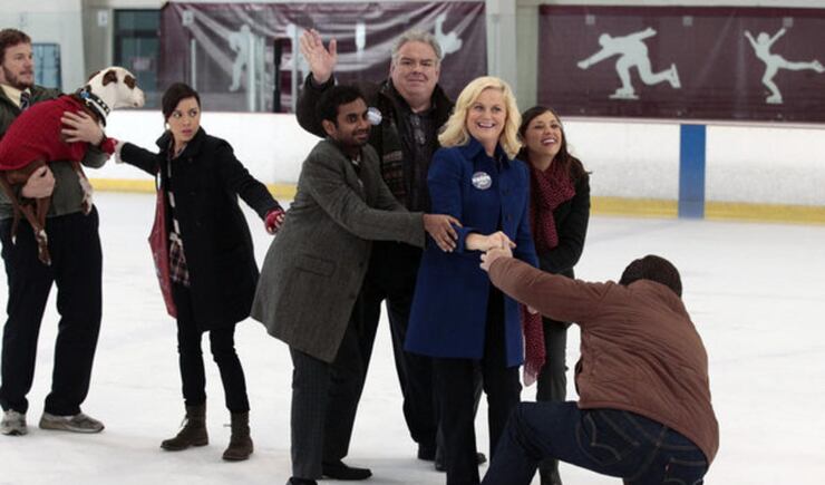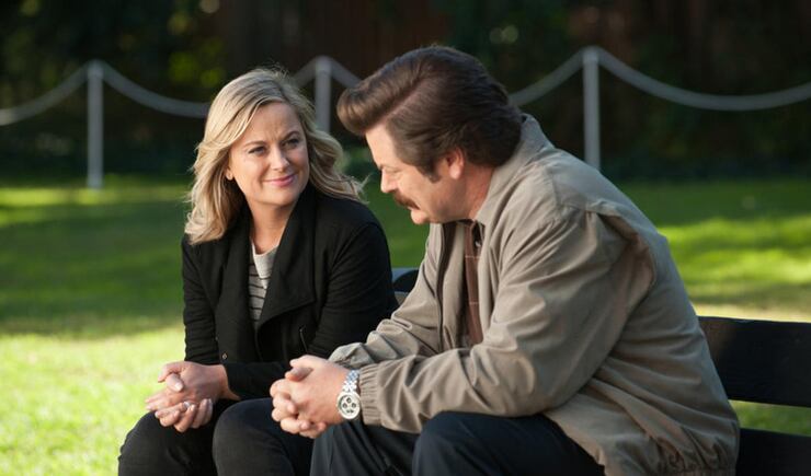Leslie and Ron’s friends lock them in the Pawnee Parks and Recreation office overnight, forcing them to reconcile.