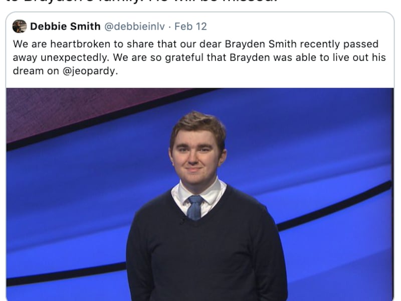 Brayden Smith, the final five-game “Jeopardy!” champ in the Alex Trebek era, died following complications after surgery, a local CBS station in Las Vegas has reported.