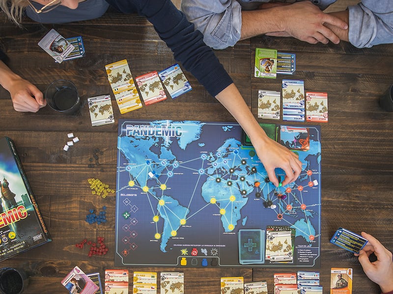 “Pandemic” is a complex team-based game where players work together to stop a disease outbreak. Each round, the disease spreads to new regions, and players must find cures before it’s too late.