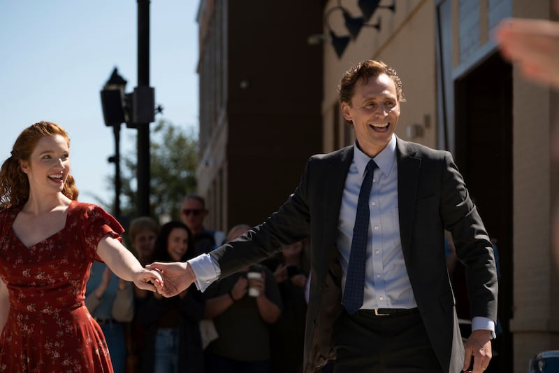 Cutting through the underwhelming response to threats of human extinction, Chuck (Tom Hiddleston) makes his first appearance. Billboards, lamp post banners and TV ads featuring a posed photo of Charles Krantz, with the words, “39 Great Years! Thanks Chuck!” are plastered everywhere.