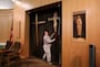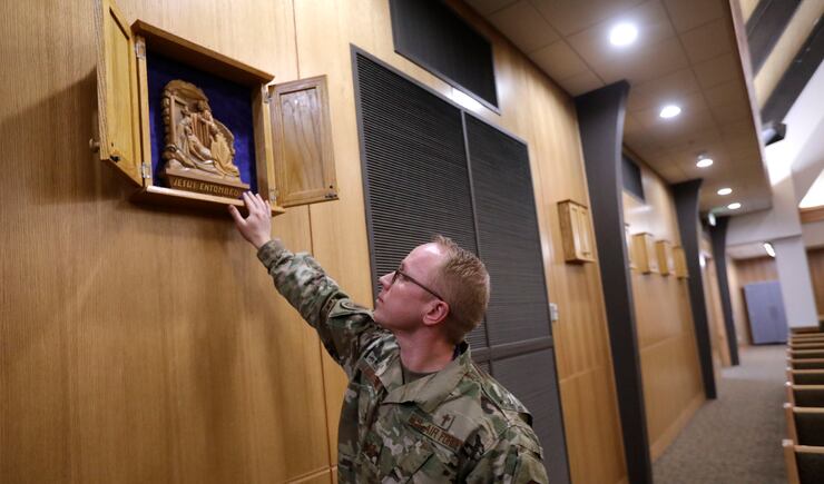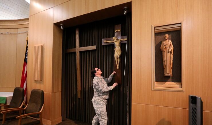Tech. Sgt. Crystal McClellan, a noncommissioned officer in charge of religious affairs, works with others to make sure the sanctuary inside the base chapel is prepared for the different worship services held each Sunday. In a matter of minutes they can be ready for a Catholic or Protestant service.