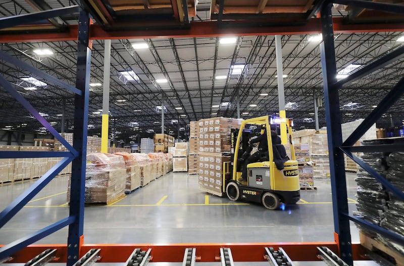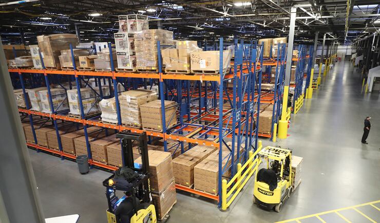 Talks began on Monday. Clearance came Tuesday and by Wednesday morning, storehouse workers Chris Neuteboom and David Vazquez zipped up and down broad concrete aisles at 15 mph on forklifts, gathering the pallets and placing them on Project Hope’s truck. They wheeled expertly between giant, orange-and-blue shelves in the 540,000-square-foot warehouse.