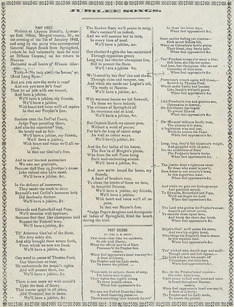 With his lawyer dressed in his finest coat and vest, things couldn’t go better for Joseph. The judge ruled that Missouri’s claims to arrest the Prophet were invalid. Upon returning home, the Prophet hosted a party. Wilson Law, Willard Richards and Eliza R. Snow composed “Jubilee Songs” in praise of the political figures who assisted Joseph.
