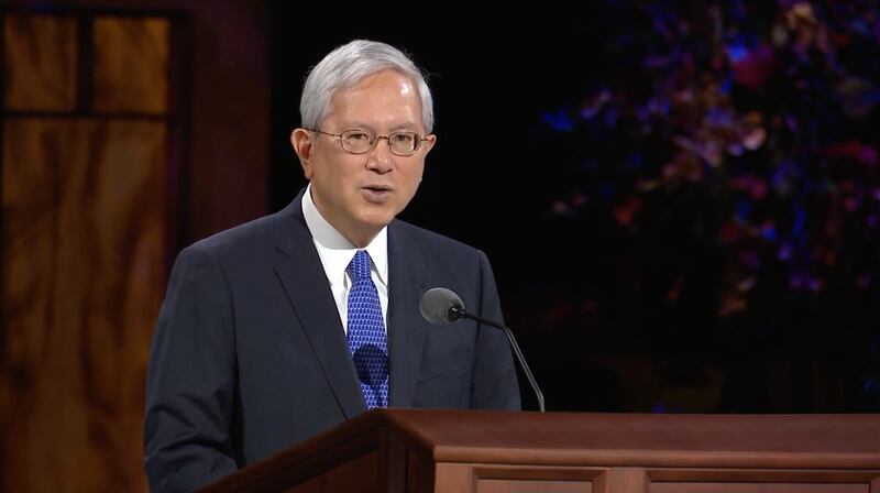 Elder Gong was absent when the conference began Saturday morning. He was scheduled to speak Saturday afternoon, so he pre-recorded his remarks. President Dallin H. Oaks, first counselor in the First Presidency, explained Elder Gong’s absence at the start of the afternoon session.