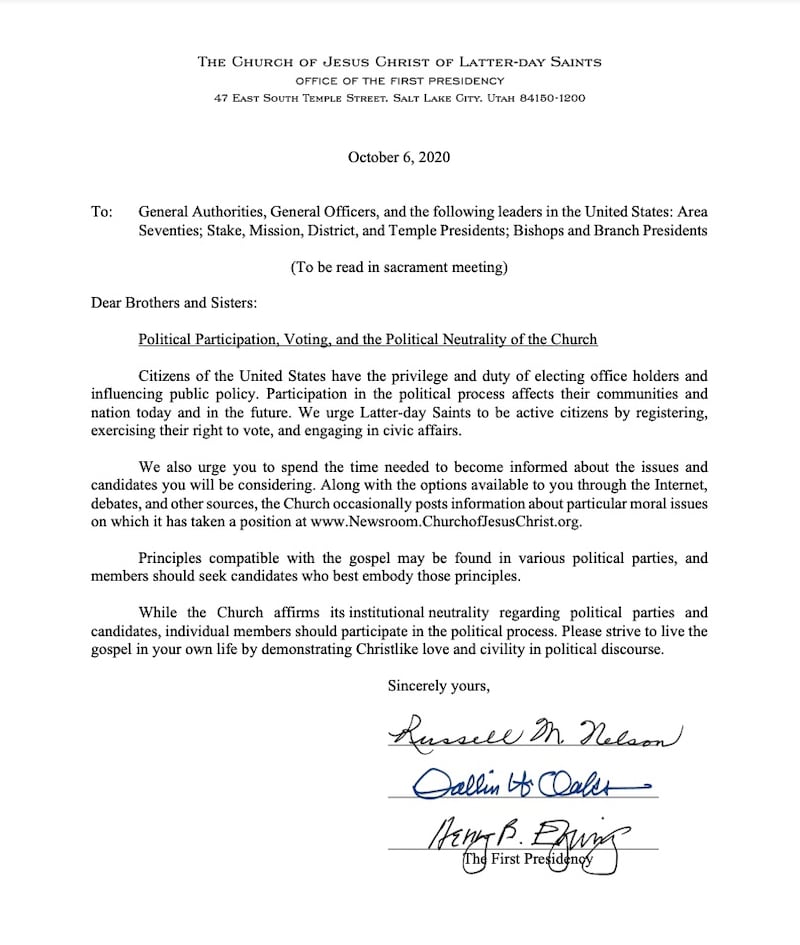 Latter-day Saint leaders regularly issue a letter before elections. As usual, Tuesday’s letter noted the church’s position of institutional neutrality with regard to political parties and candidates.