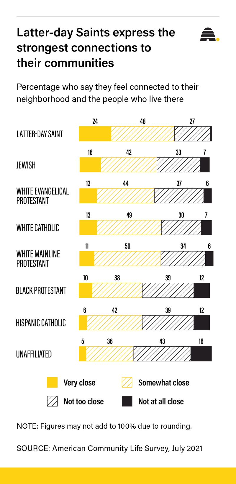 Latter-day Saints feel more connected to their neighbors and communities than any other religious group in America, according to a new study released by the Survey Center on American Life.