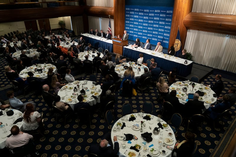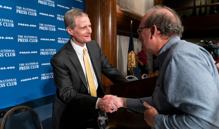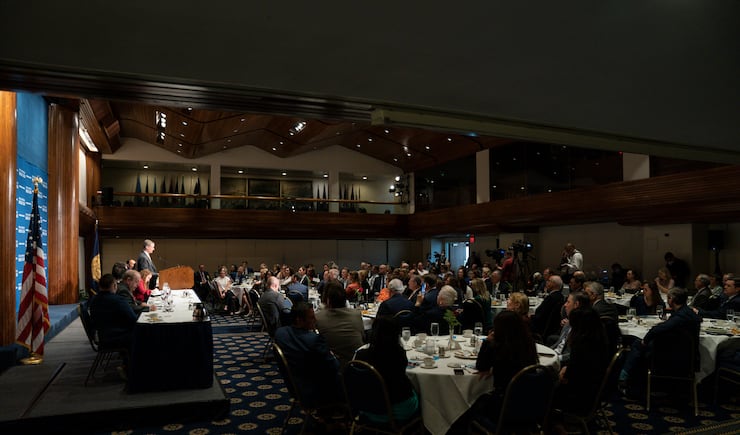 The 114-year-old National Press Building is a quarter mile from the White House and within sight of the top of the Washington Monument. Reporters and other participants arrived for the lunch under overcast skies on a typically humid Washington spring day alleviated by merciful breezes.