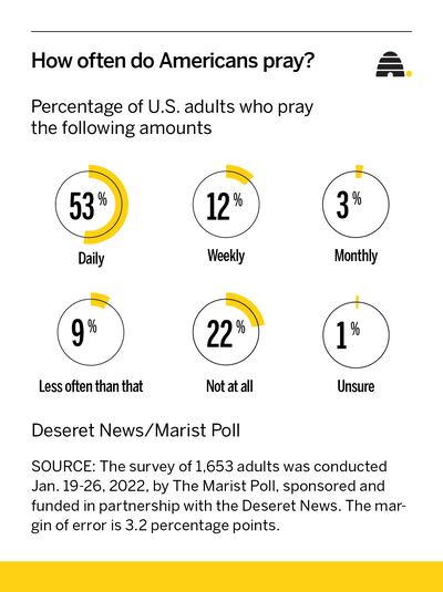 The Faith in America survey showed that more than half of Americans (53%) pray at least daily. That’s more than twice the share who don’t pray at all (22%).