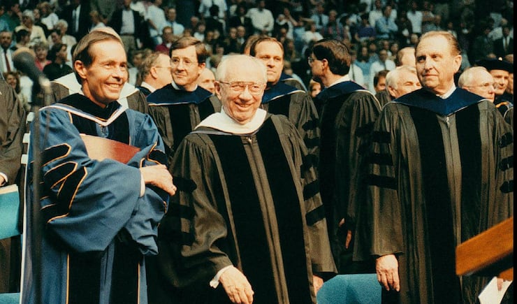 “Carl called me to say that on fast Sunday he was fasting and praying, and the Lord told him he should accept our offer,” President Oaks said. “The Lord simply turned his no into a yes. Of course, he later became dean. I didn’t turn immediately to the men who were waiting for me to continue the meeting. I looked out the window. I looked up at the Provo Temple. It was a very emotional moment for me, because I had started off saying it was a bad idea, because I couldn’t see all this coming together.”