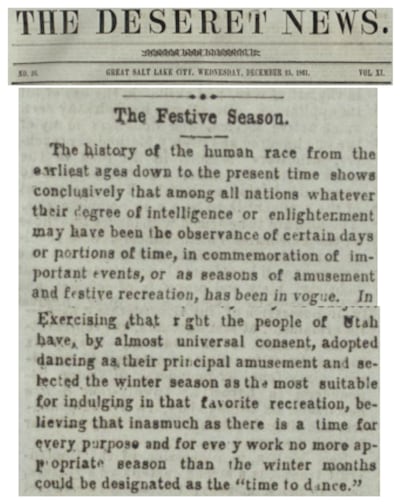 1. Dancing. Dancing was almost universal in early holiday gatherings — from intimate family settings to larger church and community parties. On Christmas day in 1861, the Deseret News issued a statement on the place of dancing in Latter-day Saint holiday culture that, Kimball notes, sounded almost like “an official decree.”
