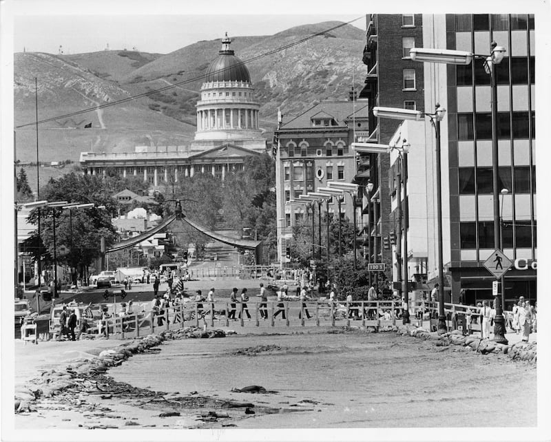 For 13 days, the new, improvised waterway redefined the city.. Pushing past two makeshift levees, the “State Street River” eventually stretched to 1300 South, where sandbags turned its course and led it two miles west to the Jordan River. Wooden bridges spanned its shore. Locals fished from its banks or ran the rapids in their kayaks. The national press descended on the scene, capturing the moment in Norman Rockwell tones. The Washington Post called Salt Lake City “The Venice of the high desert,” and ran a photograph of a young woman in a wheelchair who joined the human chain to help pass sandbags. More importantly, it became a monument to community spirit and cooperation.