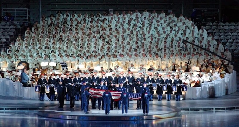 With 3.5 billion watching on television, the then-Mormon Tabernacle Choir sang “The Star Spangled Banner” at the Opening Ceremonies as U.S. Olympic team athletes held a tattered American flag from the rubble of the World Trade Center.