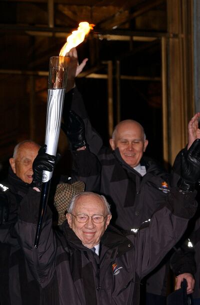 On the eve of the Games, President Hinckley raised the Olympic torch as the relay reached Salt Lake.