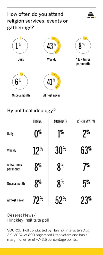 A Deseret News/Hinckley Institute survey conducted by HarrisX from Aug. 2-9 asked 800 registered Utah voters how often they attend religious services, and 43% of voters said they attend weekly while 41% said they almost never attend.