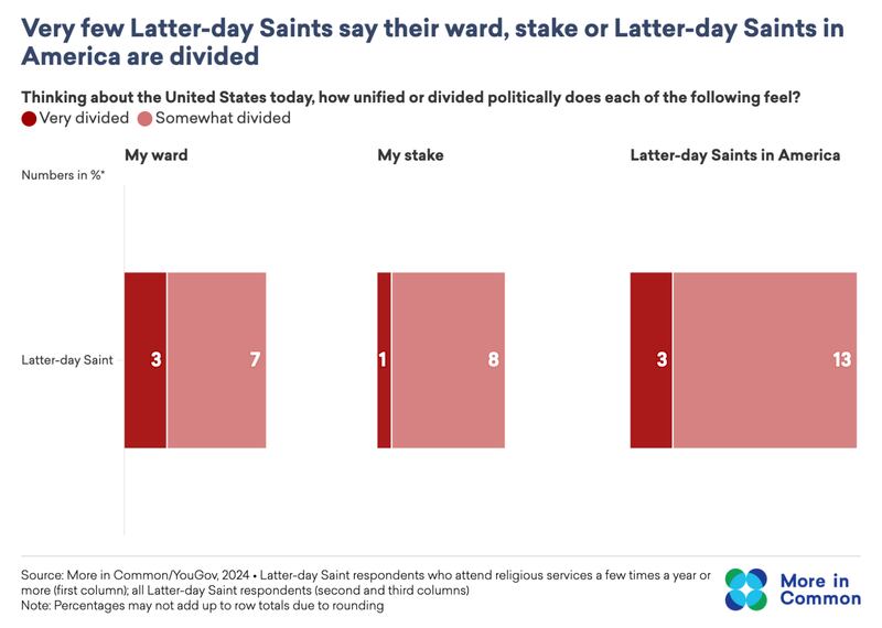 Only a fraction of Latter-day Saints (9-10%) in the study report their local stake and ward feeling divided — with 16% feeling division among Latter-day Saints in America as a whole.