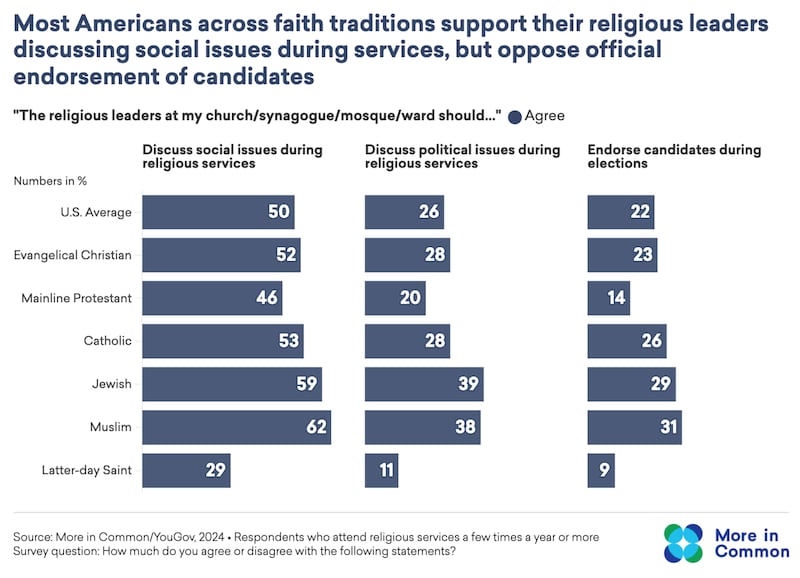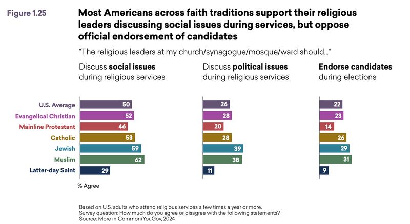 The study found many people of faith eschewing the idea that politics ought to be involved in faith. Specifically, they found that only one in 10 Latter-day Saints support the idea of faith leaders engaging in political discussions (11%) or candidate endorsements (9%).