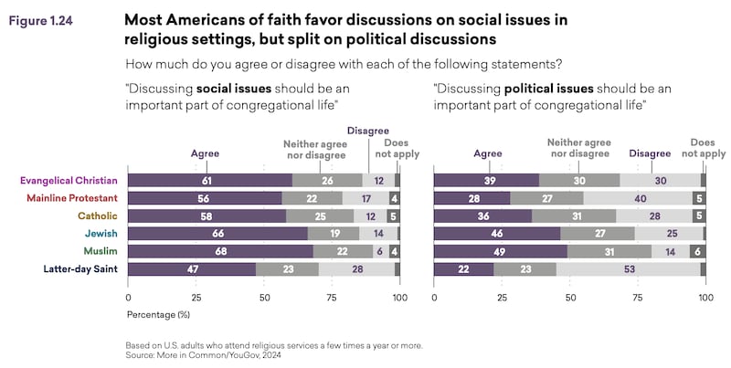 Opens in new windowThe authors concluded that compared to other religious groups, “Latter-day Saints are least in favor of politics in the pulpit” — meaning they are least likely to support political conversations in religious settings. As evident below, only around 1 in 5 (22%) believe that discussing political issues should be an important part of “congregational life.”