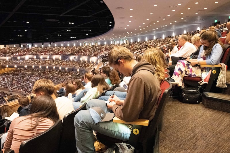 About 10,000 seminary and institute students packed the University of Utah’s Huntsman Center in October for a devotional with Elder Ronald A. Rasband of the Quorum of the Twelve Apostles. Elder Rasband also sits on the Church Board of Education, which acts as the board of trustees for the BYUs and Ensign College.