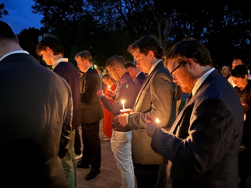 About halfway through, a light drizzle began, and a student stood by Kirk’s portrait with an umbrella, shielding it from the rain. Then, the crowd, aglow with candlelight, bowed their heads and prayed.
