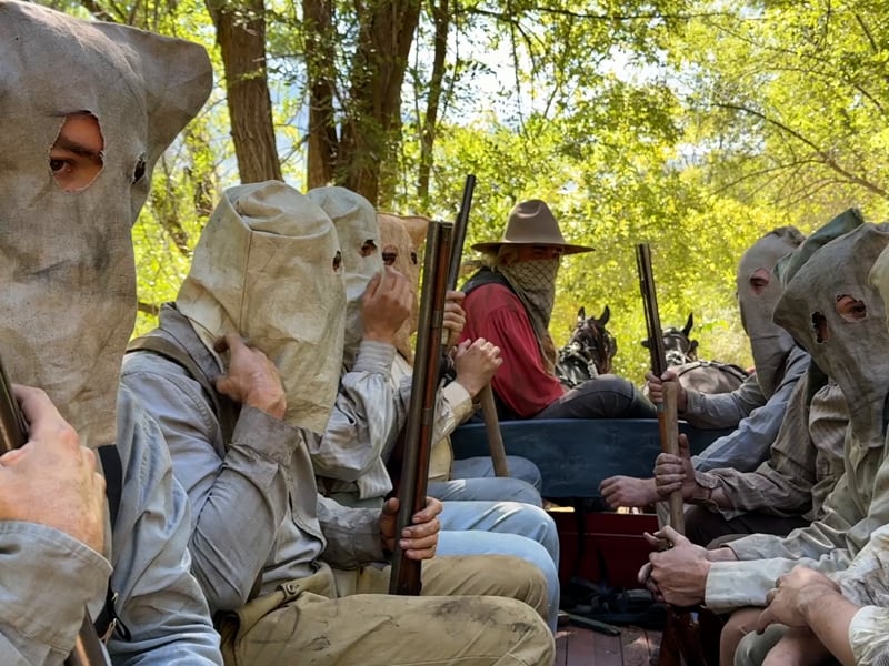 Mason cited sources describing “masked men, armed with revolvers and wearing robes decorated with a red cross, skull and crossbones” seen riding near the Latter-day Saint settlements to enforce these orders.