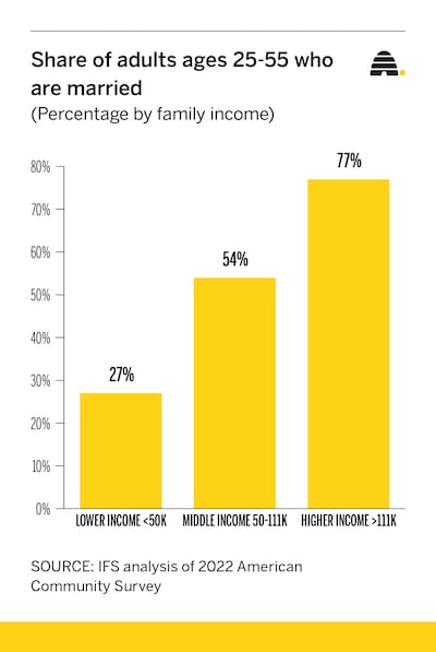 The first is a two-tier society, where wage gaps and relationship gaps are at risk of becoming permanently entrenched chasms that cannot be crossed. We see this in the marriage rates among 25-55 year olds. In households earning more than $111,000 a year, the share of people married is 77%. Those households earning less than $50,000, by contrast, only have a 27% share married. Given that relationships are role-modeled, “caught, not taught,” the rise of children growing up with lone parents, and neighborhoods full of lone parents, means relationship equity is being eroded and lost in too many of America’s communities.