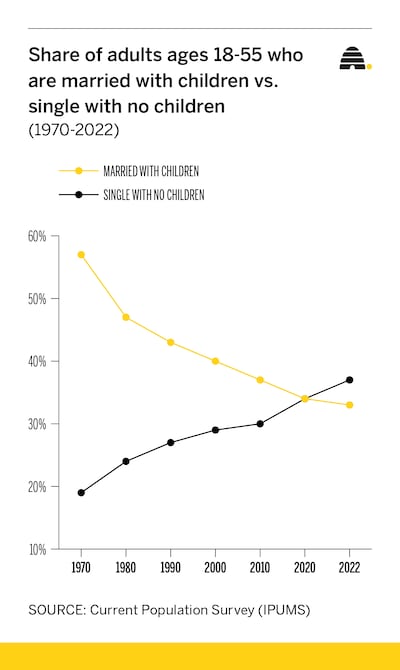 These antisocial shifts away from marriage, family, faith and civic engagement have resulted in dire consequences. On the family front, America has just crossed a historic threshold where, of adults aged 18-55, there is now a greater share of single adults with no children than there are married adults with children. This rise of what the Chinese call “bare branches” — individuals who do not marry and do not have children — is a big reason why deaths of despair have surged and happiness has fallen.