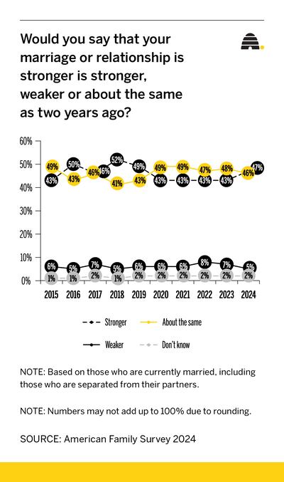 “There may be reasons for that pessimism,” he said. “They may be thinking about the marriages that end in divorce, and some do, and there are marriages that are bad and that are unhappy. But that’s not the average response for most Americans when they think about their marital relationship.”