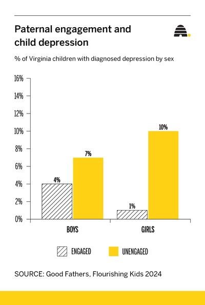 The story is mirrored when it comes to girls and depression. Girls with engaged dads are 9 percentage points less likely to be diagnosed as depressed, compared to their peers with less involved dads. By contrast, boys with less involved dads were just 3 percentage points less likely to be depressed. Clearly, good dads make for less-depressed girls and better-behaved boys in Virginia.