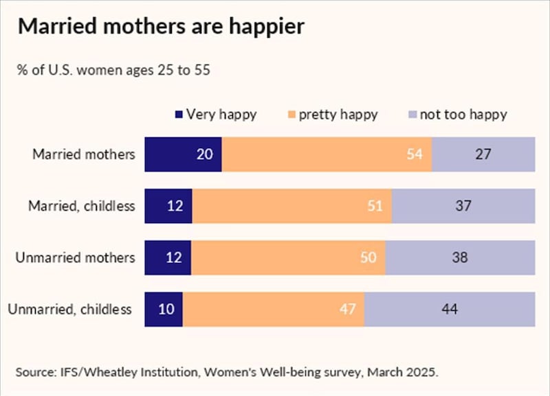 The new Family Studies/Wheatley report and the General Social Survey, which the authors of the report call “the nation’s leading social barometer,” both find married moms are happier than single women whether they have children or not and happier than married women without children, too. Other research backs that up.