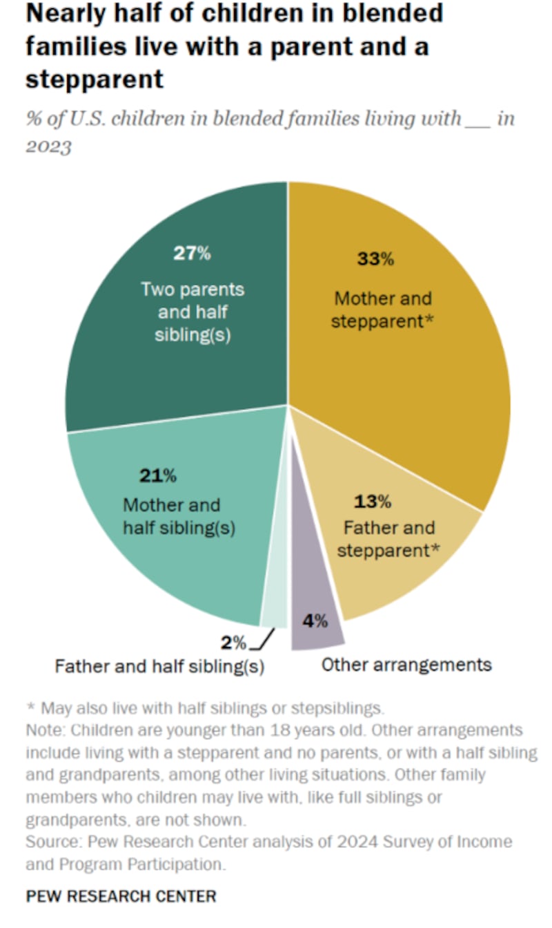 Blended families are any that include a stepparent, stepsiblings and/or half siblings, according to a new report from Pew Research Center called “5 facts about U.S. children living in blended families.”