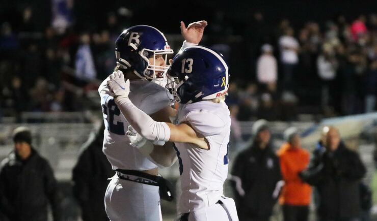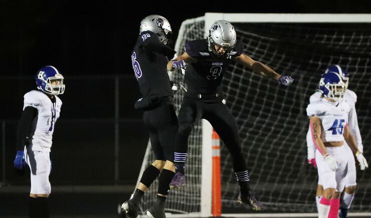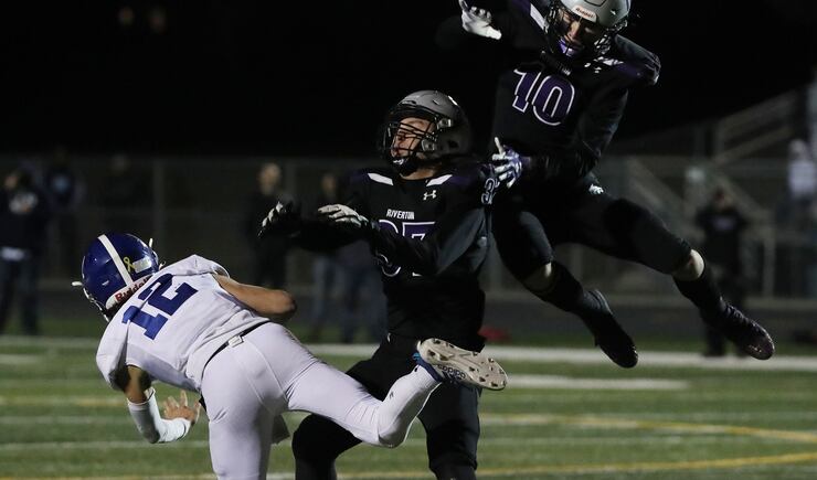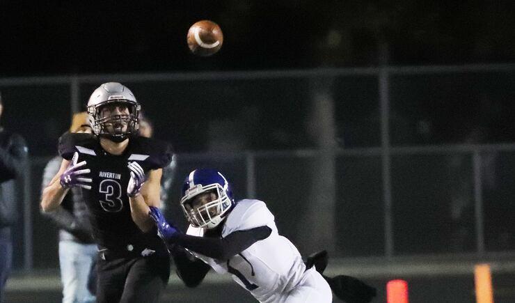 Riverton quarterback Colby Barton threw for three touchdowns to three different receivers. Wideout Josh Jacobson contributed to the victory by scoring twice, once by being on the receiving end of a Barton throw and also scoring by rushing into the end zone.