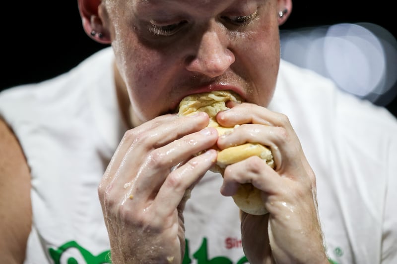 I then looked down the line of eaters. Thomas stood out. Pieces of bun flew in all directions when the dogs slammed into his mouth. Water dripped from his soaked T-shirt. Pieces of stray dough peppered his beard. It was gross — but understandable. He was close to the lead.