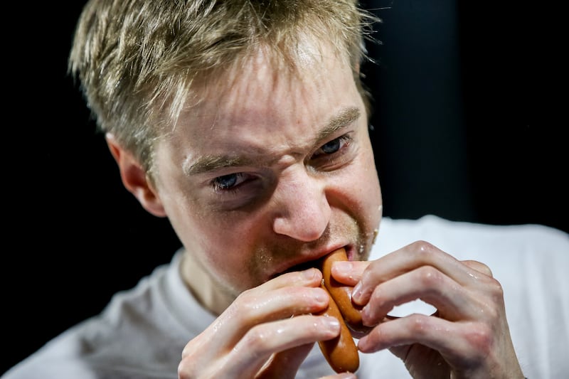 I grabbed a sausage. My chewing couldn't match the speed of the moment. Forty seconds. It took 40 seconds just for the dog. I dipped the bun in water. Wet bread, it turns out, doesn’t taste very good. I nearly reversed from that alone. All around me arms flailed. Water spilled. Pieces of bun flew through the air like mosquitoes. I finished one. The leader was up to six.