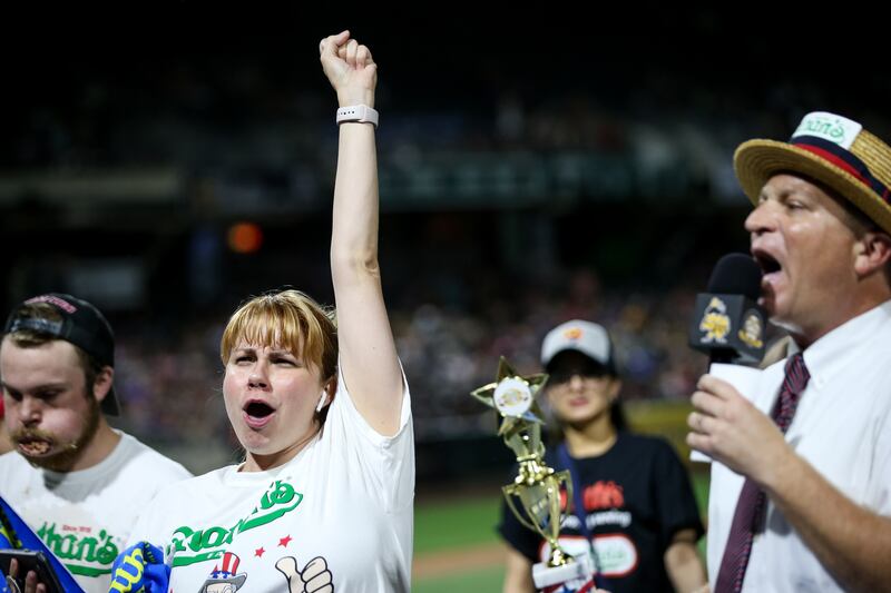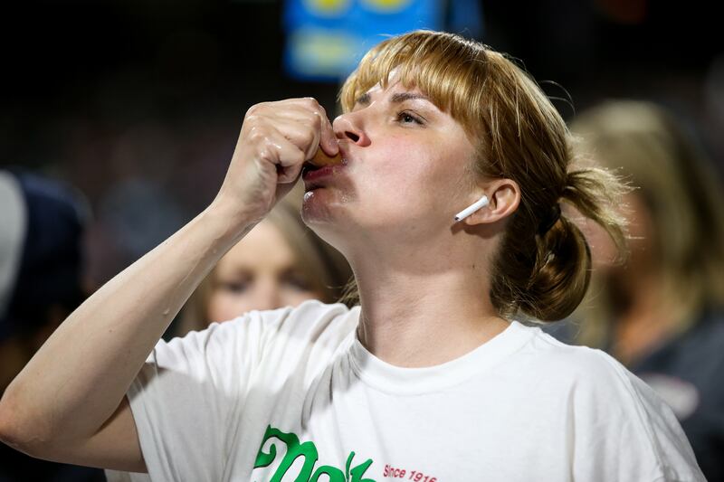 When I reached my seat, the entire row was empty. Maybe only a handful of people even registered, I thought. Until halfway through the first inning, when a woman with blonde bangs, chipped pink toenail polish and an easy smile sat down next to me. She introduced herself as Katie, and she looked familiar. I soon discovered why: She was two-time Coney Island contestant Katie Prettyman, whose record is 14.5 dogs. She'd driven 14 hours to be there.