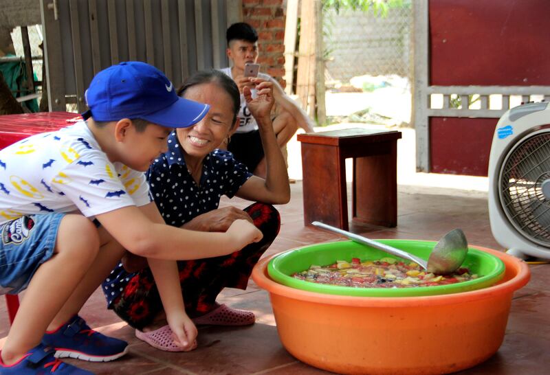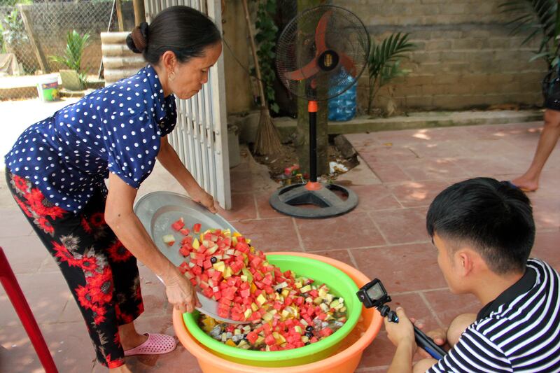 Luong Anh Bao can’t imagine ever getting tired of watching Tan’s videos. The grade-schooler, who came with his father to visit Tan on the day she made the gelatin fruit salad, has seen all of the videos multiple times. “The first time I saw Ba Tan’s video, I really liked it,” he said. “I watched it many, many times now. Repeatedly.”