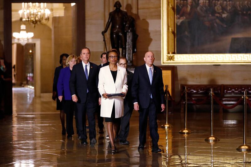 House Intelligence Committee Chairman Adam Schiff of California and Judiciary Committee Chairman Jerrold Nadler of New York will lead a team that has extensive courtroom and impeachment experience. They include Representatives Hakeem Jeffries of New York, Sylvia Garcia of Texas, Val Demings of Florida, Jason Crow of Colorado and Zoe Lofgren of California.
